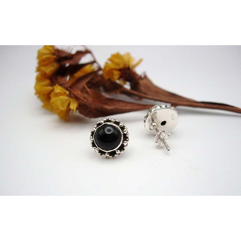 Clous d'oreilles en argent massif et Pierre Onyx noire, en provenance directe de l'Inde. Comme pour tous nos bijoux, l'argent est poinçonné 925/1000e par le fabricant, puis contrôlé et poinçonné par nos soins.