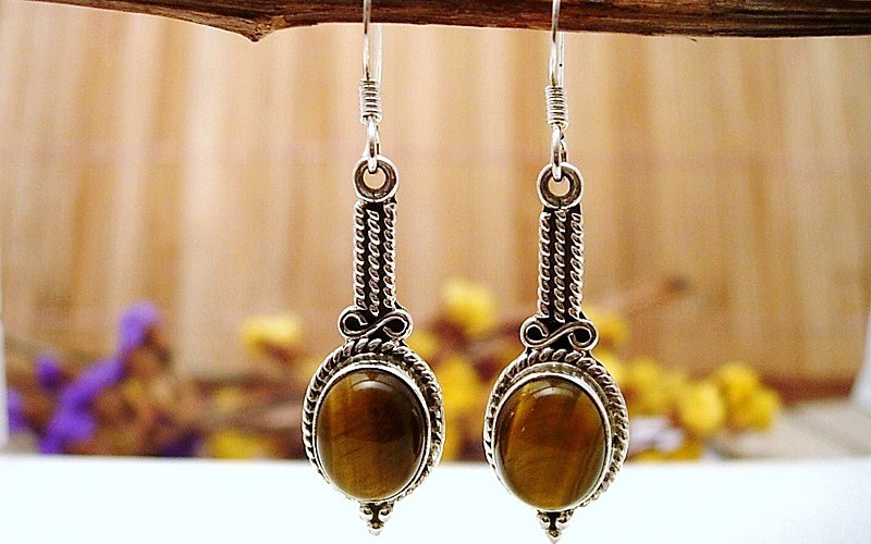 Boucles d'oreilles en argent avec Oeil de tigre, en provenance directe de l'Inde. Comme pour tous nos bijoux, l'argent est poinçonné 925/1000e par le fabricant, puis contrôlé et poinçonné par nos soins.